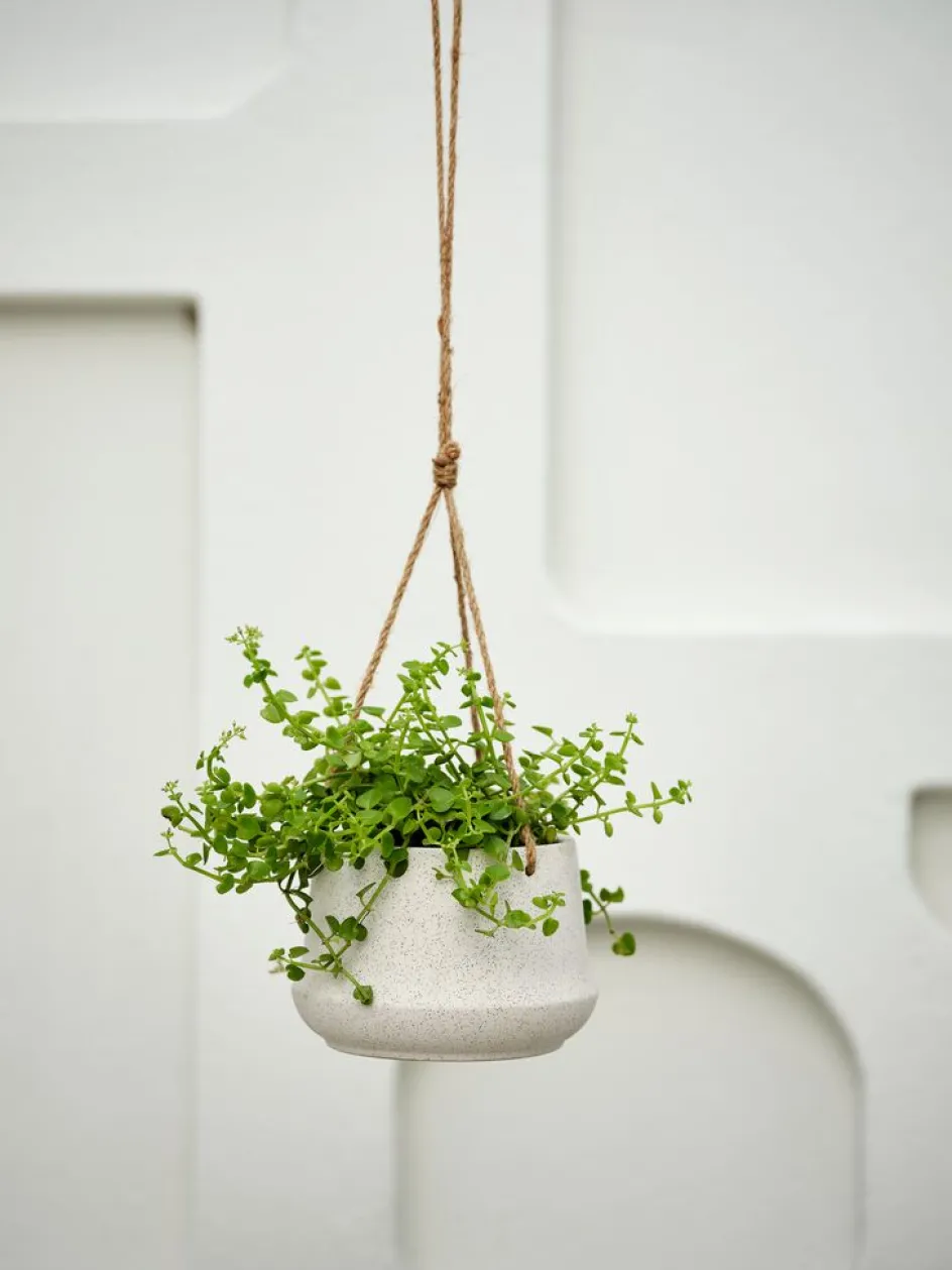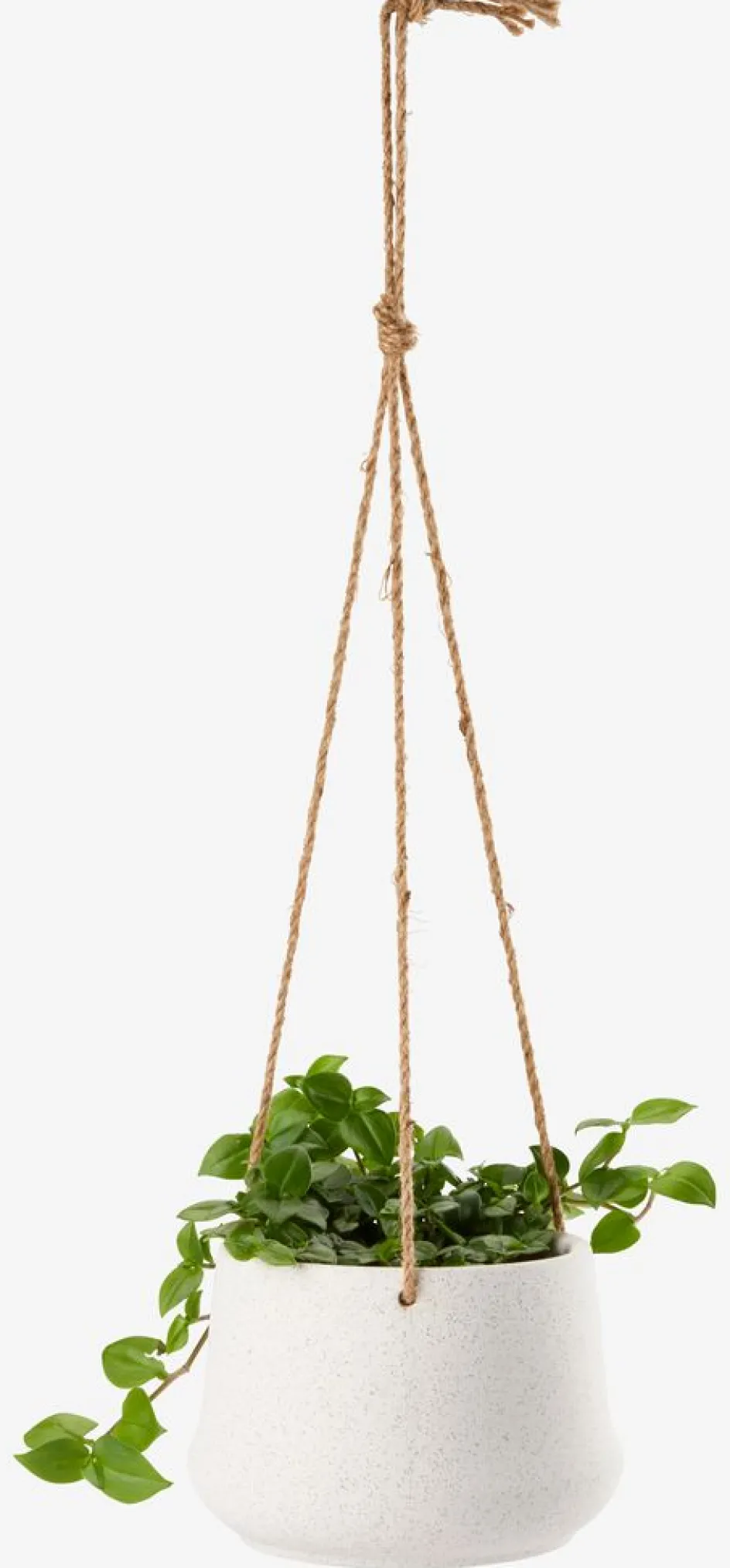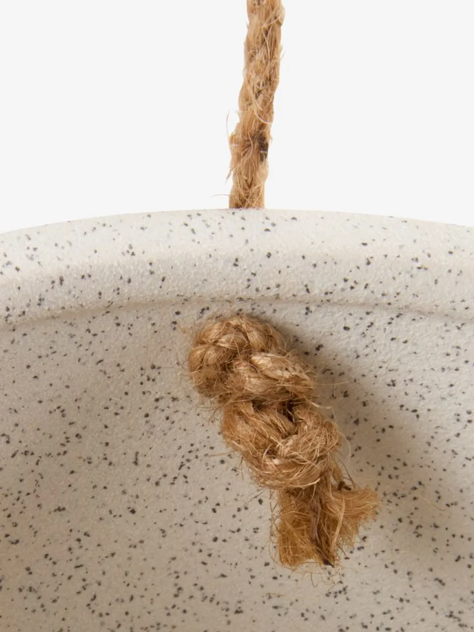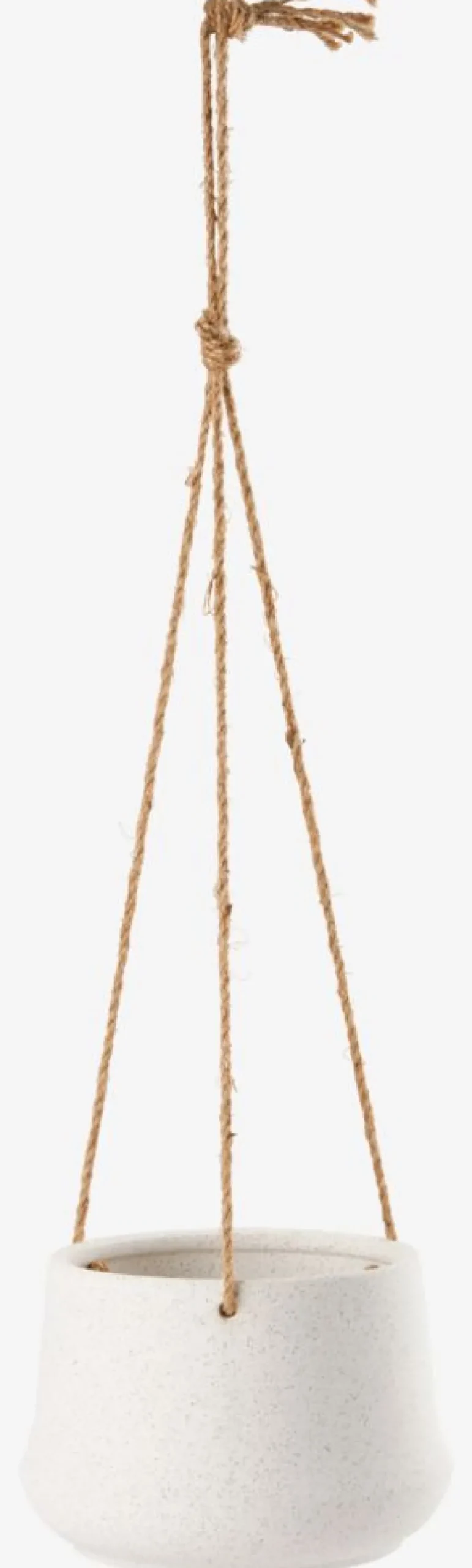 Jardinière suspendue en argile avec une corde en jute. Ce pot est idéal pour les petites plantes et apporte un charme naturel à votre pergola ou balcon. Ø15 x H12 cm