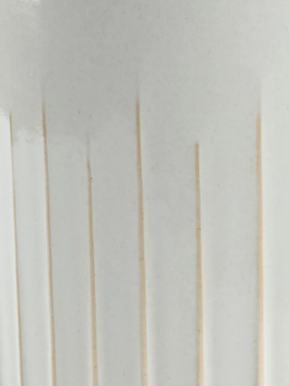 Cache-pot en grès blanc cassé. La forme simple et arrondie est accentuée par un design à rainures verticales, qui ajoute une qualité subtile au toucher. Sa couleur neutre et son style moderne en font une pièce décorative polyvalente pour exposer des plantes. Ø20 x H18 cm