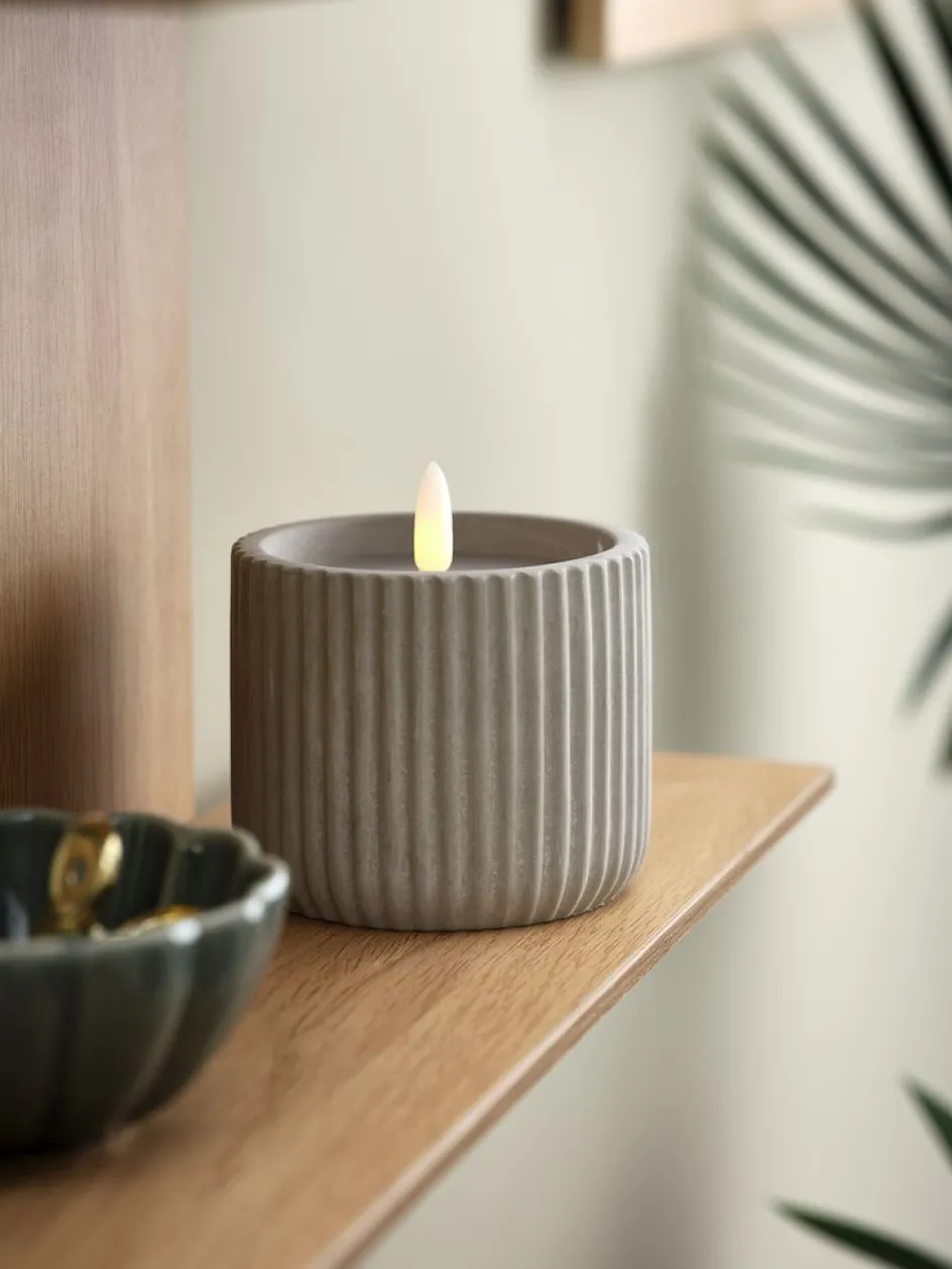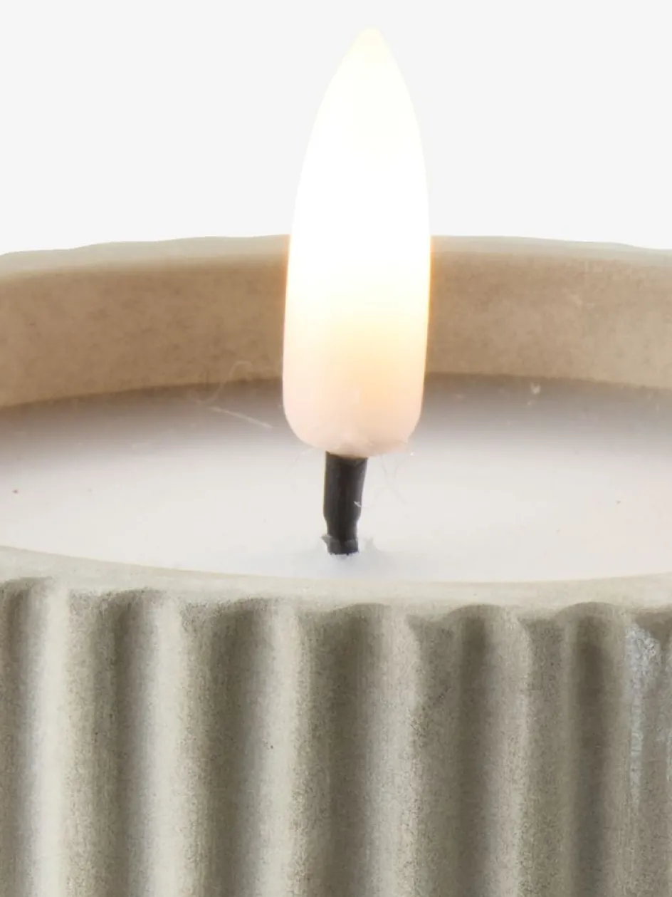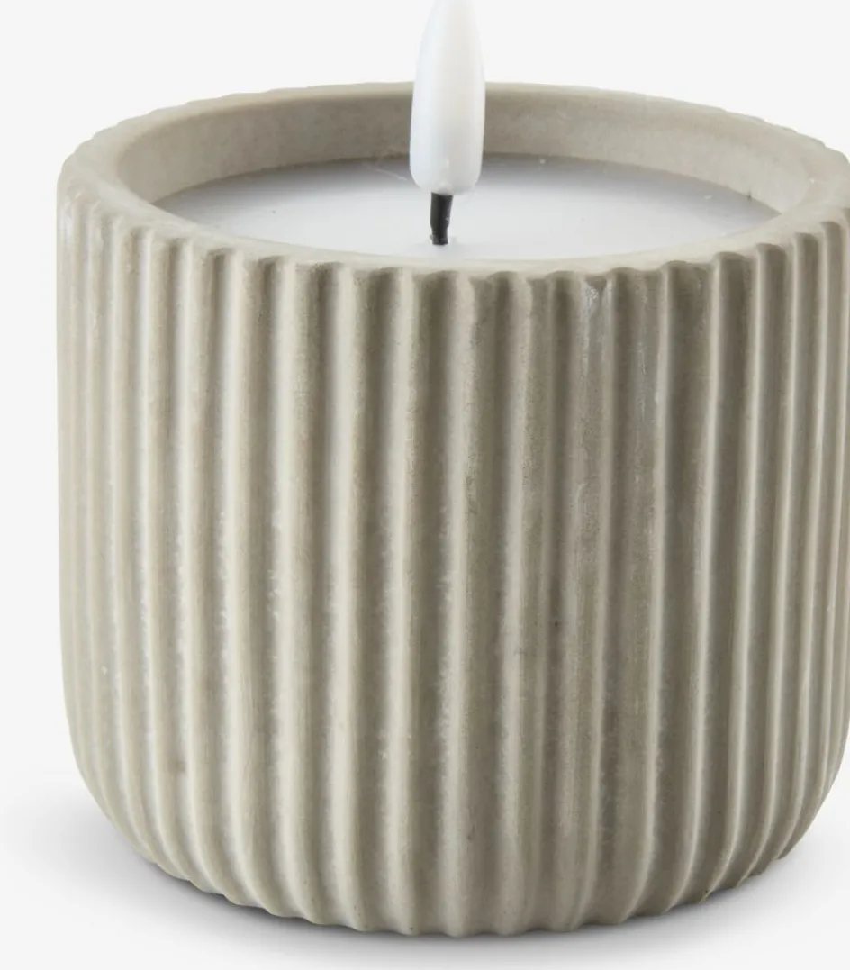 Bougie LED blanche dans un contenant en ciment gris. Elle dispose d’une fonction minuterie pratique avec des intervalles de 6 heures allumée et 18 heures éteinte. Cette bougie a la taille parfaite pour n’importe quel espace. Nécessite 2 piles AAA (non incluses). Ø9 x H8 cm