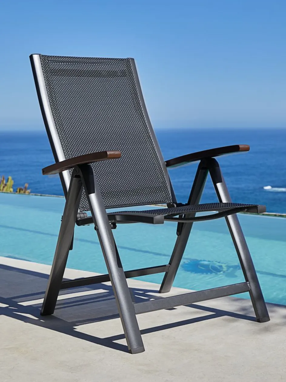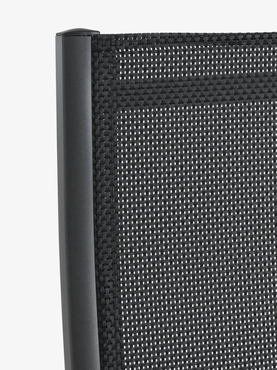 Chaise inclinable grise avec assise et dossier en textilène et structure en aluminium. Les accoudoirs sont en bois FSC® huilé pour un aspect élégant. Le dossier peut être incliné en 6 positions. Le textilène est un matériau confortable et inaltérable qui sèche rapidement et se nettoie facilement. L’aluminium est un matériau léger et robuste qui ne rouille pas. Le bois résistant est traité avec de l’huile pour le protéger et rehausser sa couleur naturelle. Il est recommandé d’huiler régulièrement le bois pour maintenir sa couleur et le protéger de l’humidité. La chaise de jardin peut être pliée à plat, ce qui la rend facile à transporter et à ranger.