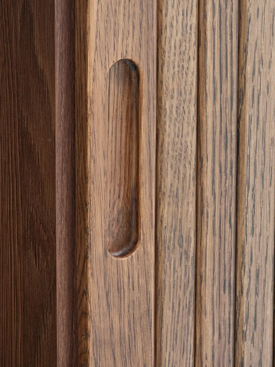 Chêne massif, placage chêne et placage décoratif. Avec portes coulissantes tambours. l120 x H50 x P40 cm
