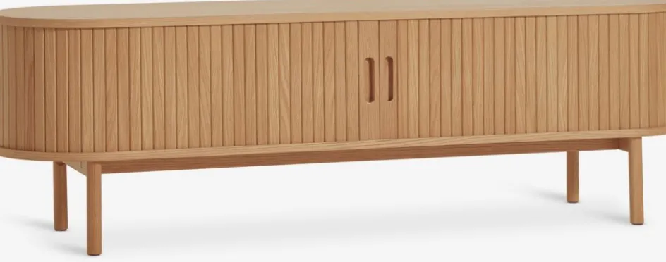 Chêne massif, placage chêne et placage décoratif. Avec portes coulissantes tambours. l160 x H50 x P40 cm