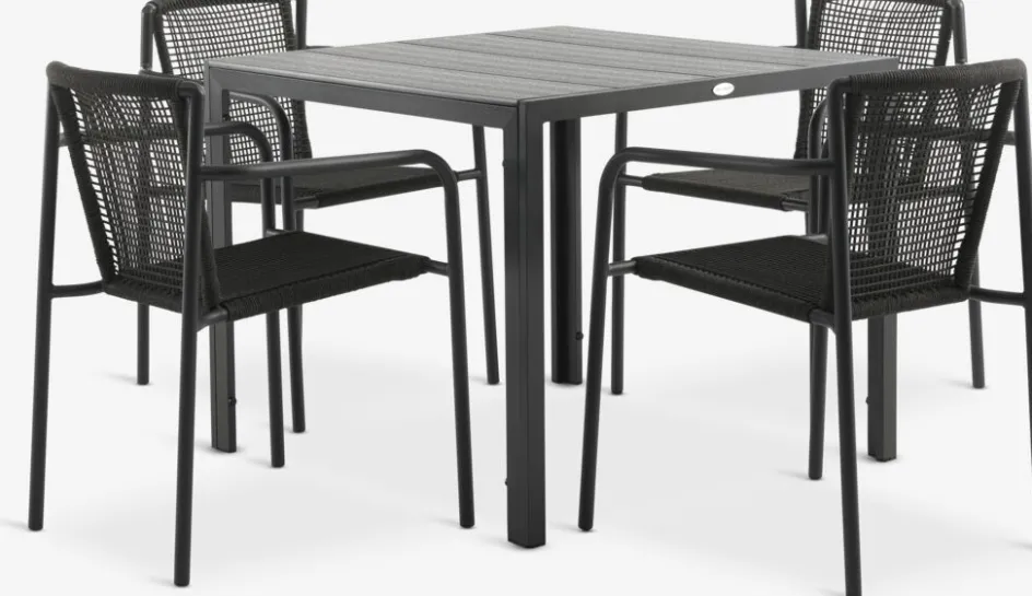 Ensemble meubles de jardin 4 places. Table: Aluminium et imitation bois. l90 x L90 x H74 cm. Chaise: Acier et polyester. Empilable.