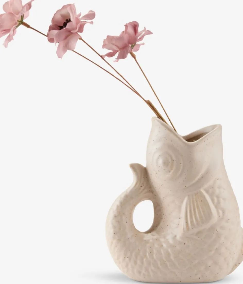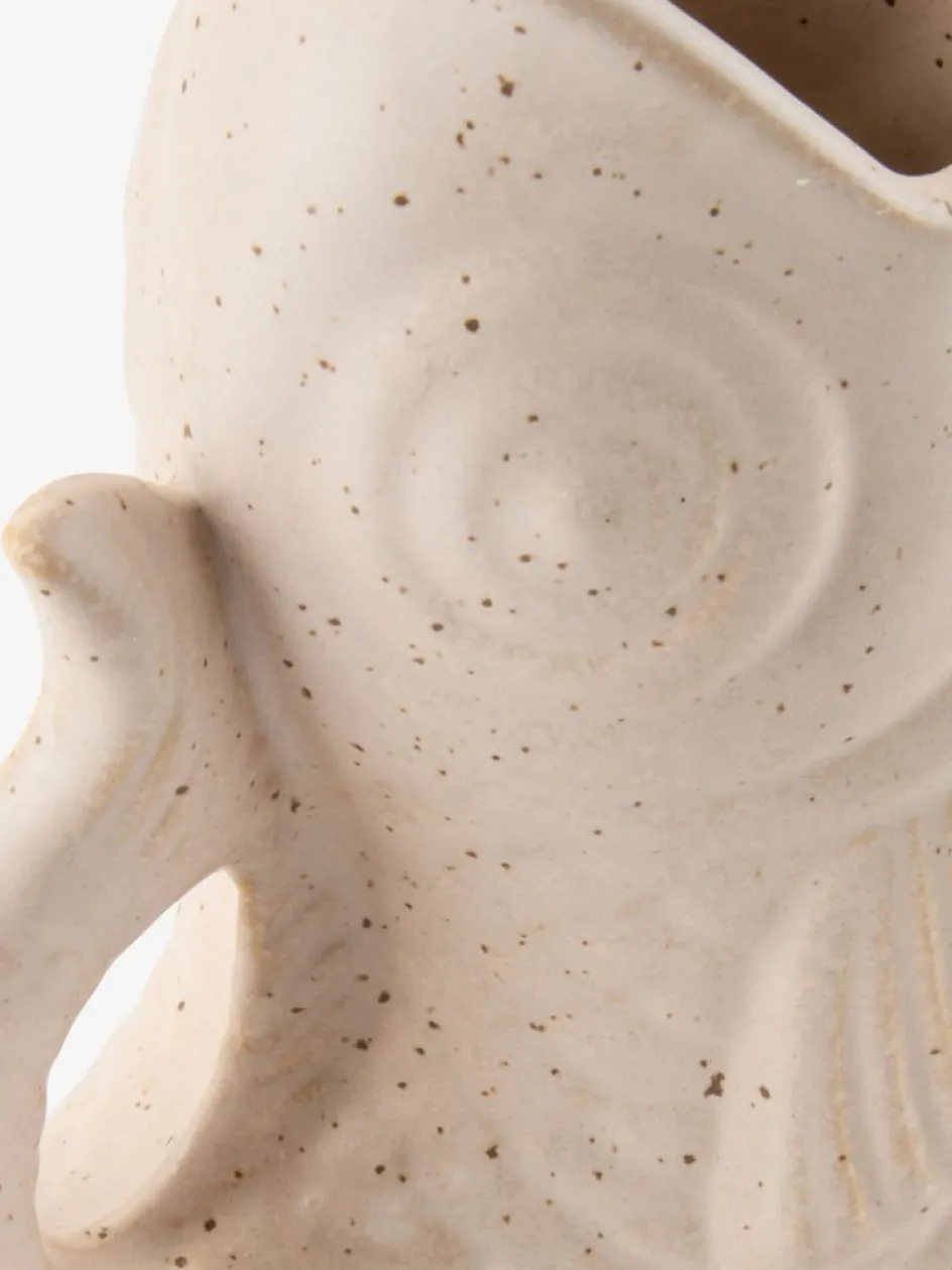 Vase en argile de couleur sable en forme de poisson. Ce vase original fonctionne comme un objet décoratif, mais il est également idéal avec quelques fleurs. l9 x H18 x P15 cm