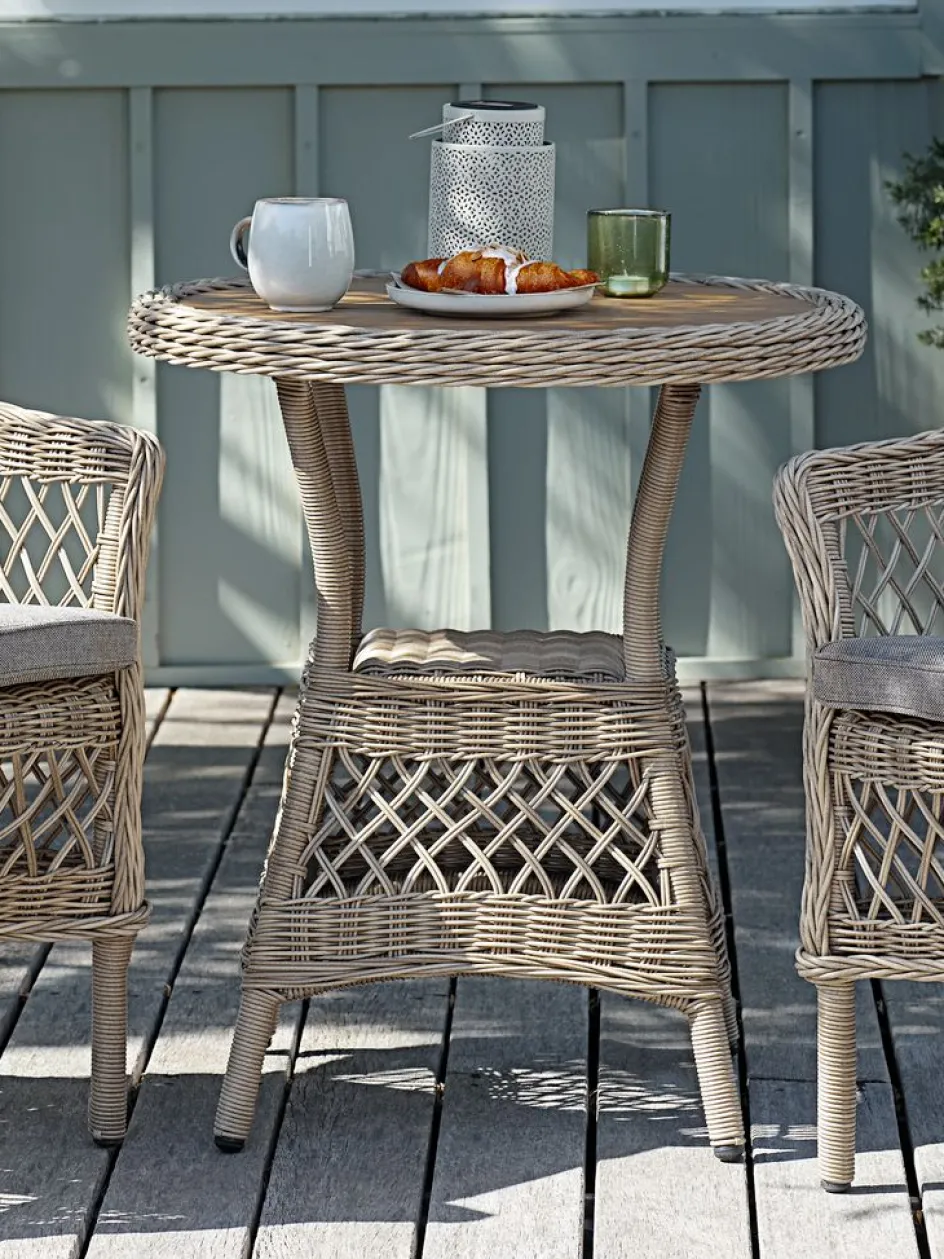 Table de bistrot ronde avec un plateau en imitation bois et un cadre en polyrotin et aluminium peint par poudrage. La tablette située sous le plateau est idéale pour ranger les petits objets tels que les magazines et les sets de table. L’imitation bois a l’apparence et la texture du bois naturel sans nécessiter d’entretien. L’aluminium est un matériau léger et robuste qui ne rouille pas. Ø70 x H76 cm