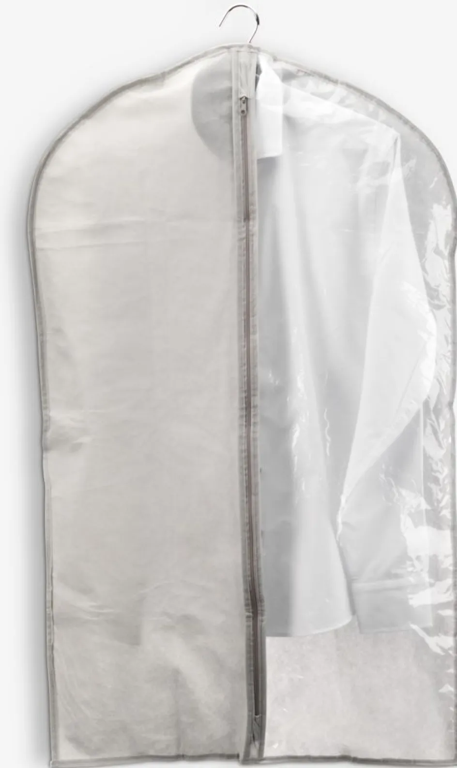 Housse vêtements conçue pour protéger les vêtements de la poussière et de la saleté. Équipée d’une fermeture à glissière et d’un côté transparent, rendant les vêtements visibles. Convient aussi bien pour le rangement dans le placard que pour le voyage. l60 x L100 cm