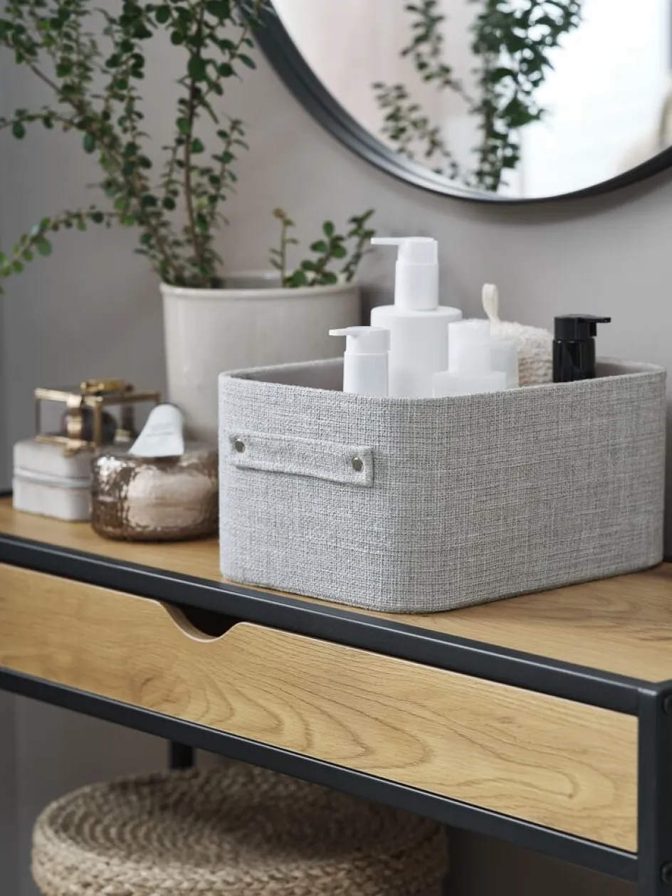 Panier en tissu gris clair avec des poignées pratiques. Sa forme compacte s’adapte parfaitement dans les placards, sous les tables ou sur les étagères. Idéal pour ranger des accessoires dans le couloir, le salon ou la chambre. l20 x L26 x H13 cm