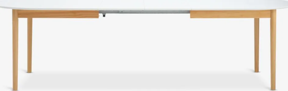 Table de salle à manger extensible avec mécanisme coulissant. Inclus : 2 rallonges pouvant être rangées sous le plateau de la table. La table de salle à manger ovale possède un plateau en MDF blanc et des pieds en bois massif. Le bois est laqué pour une plus grande durabilité. Vous pouvez facilement allonger la table jusqu’à 240 ou 280 cm pour accueillir plus d’invités. l100 x L200 x H75 cm
