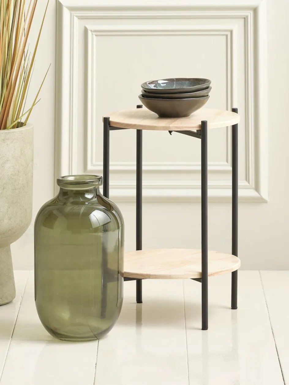 Piédestal au design épuré avec une finition en bois naturel et un cadre en acier noir. Le piédestal est doté de deux étagères rondes, idéales pour exposer des objets décoratifs ou des petites plantes. L’association du bois et de l’acier lui confère un aspect à la fois moderne et intemporel, ce qui en fait un élément polyvalent dans n’importe quelle pièce. Ø32 x H45 cm