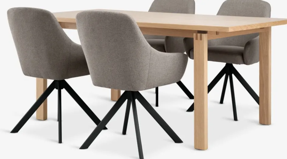 Table: Chêne massif et placage chêne. l90 x L180 x H76 cm. Chaise: Tissu. Avec base pivotante en acier.