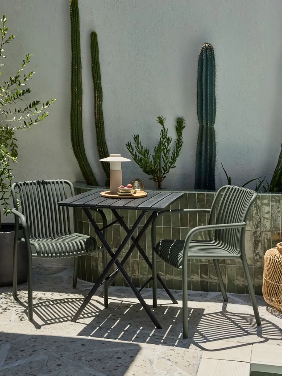 Chaise empilable verte en plastique résistant aux UV pour éviter que sa couleur ne s’estompe. La chaise de jardin peut être empilée pour un rangement compact.