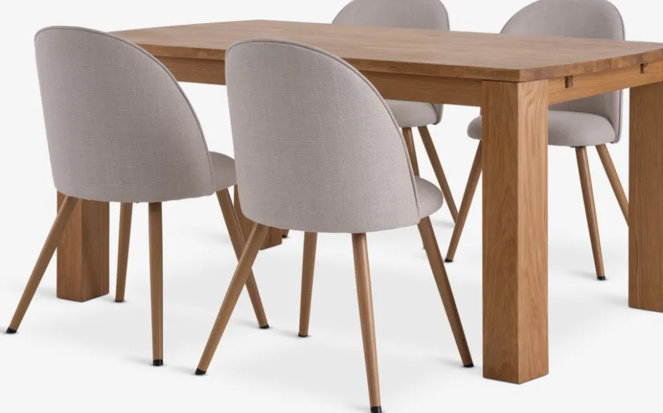 Table : plateau : panneau de particules, placage chêne, bouleau/chêne massif. Pieds : panneau de particules, placage chêne, chêne massif. Excl. rallonges. l100 x L160 x H75 cm. Chaise : contreplaqué. Revêtement : polyester. Garnissage : mousse polyuréthane (18/20 kg/m³). Pieds : acier. l52 x H84 x P54 cm