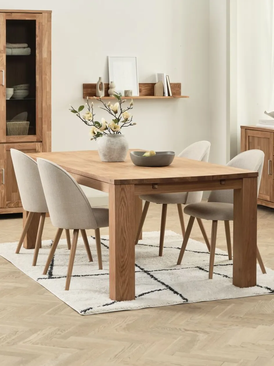 Table : plateau : panneau de particules, placage chêne, bouleau/chêne massif. Pieds : panneau de particules, placage chêne, chêne massif. Excl. rallonges. l100 x L200 x H75 cm. Chaise : contreplaqué. Revêtement : polyester. Garnissage : mousse polyuréthane (18/20 kg/m³). Pieds : acier. l52 x H84 x P54 cm