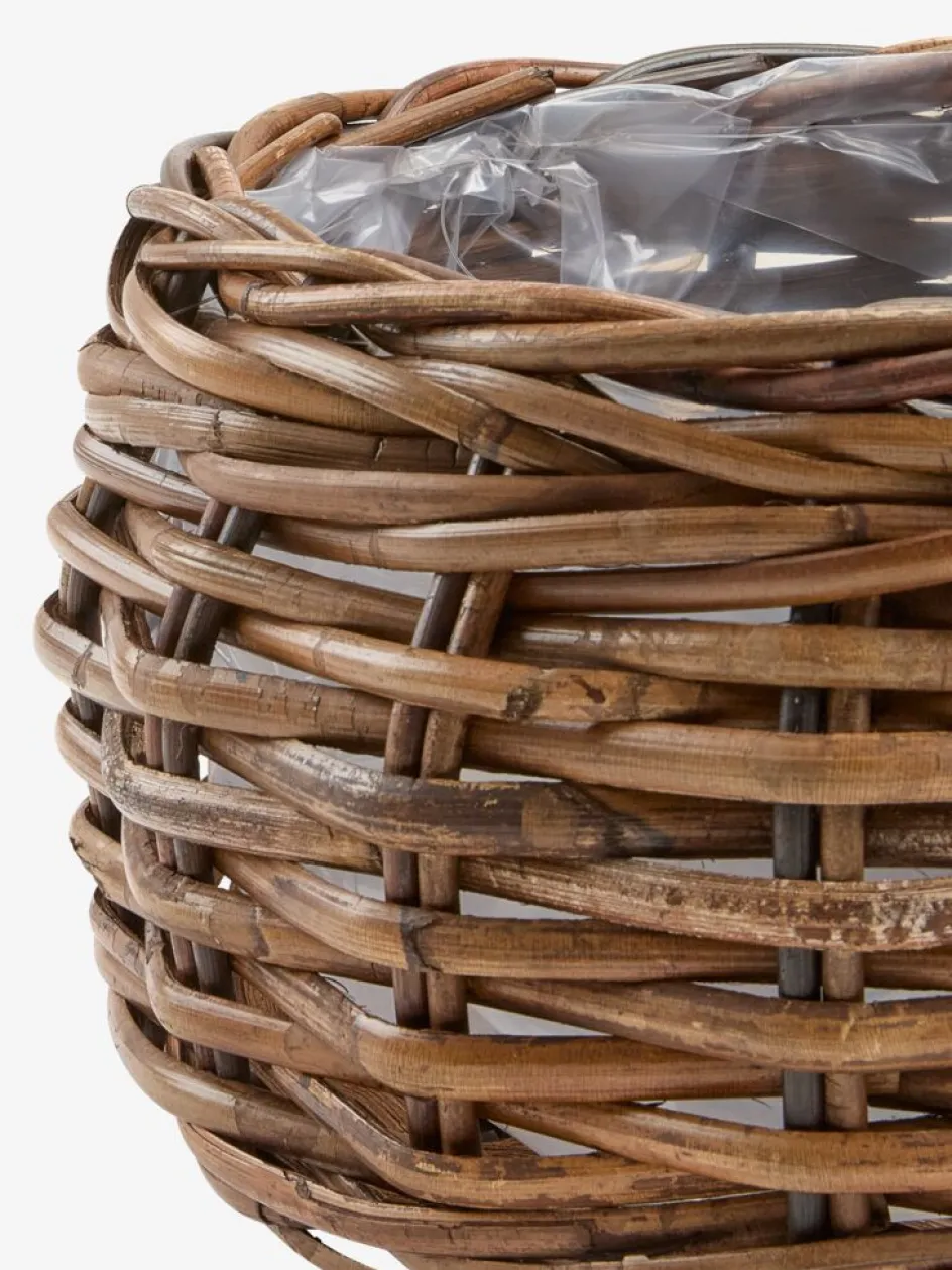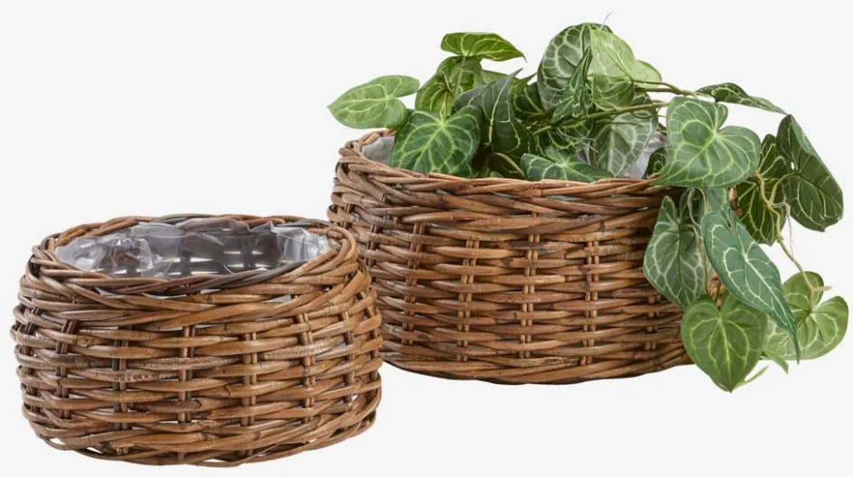 Panier pour plantes en lot de deux, tressé en kubu naturel et rotin pour un aspect rustique et texturé. Chaque panier est fourni avec une doublure en plastique pratique pour y placer les plantes. Ø49/35 x H23/19 cm
