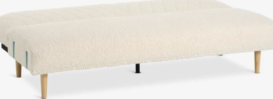 Canapé 3 places en tissu Teddy. Le canapé se convertit facilement en lit. Assise et dossier en mousse. Pieds en bois massif. Couchage: 106×190 cm. l209 x H82 x P83 cm