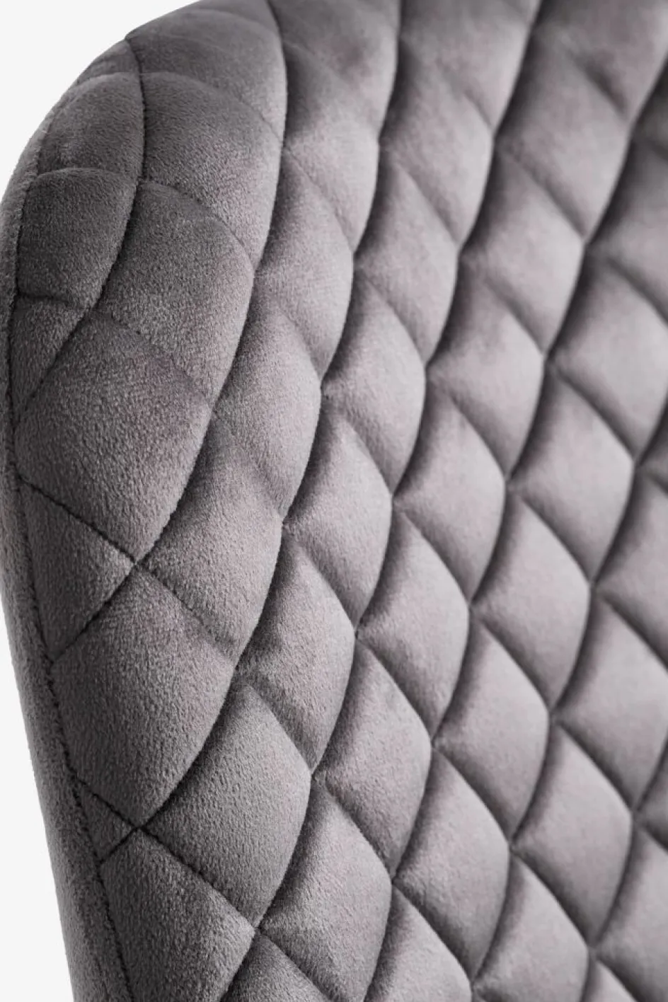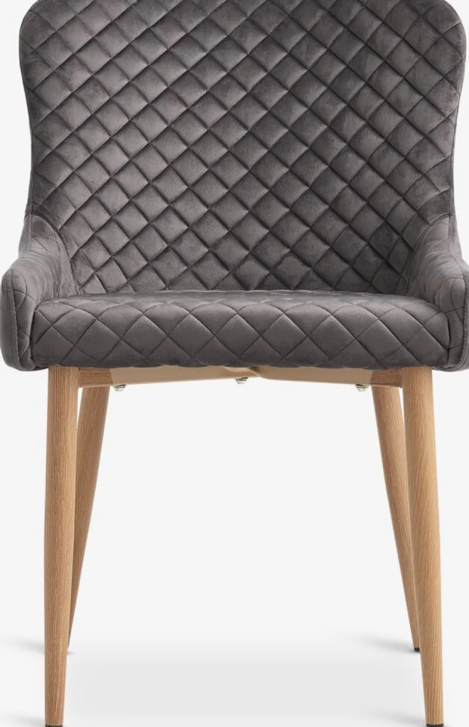 Chaise de salle à manger avec assise rembourrée et dossier en tissu velours gris. Pieds en acier aspect chêne.