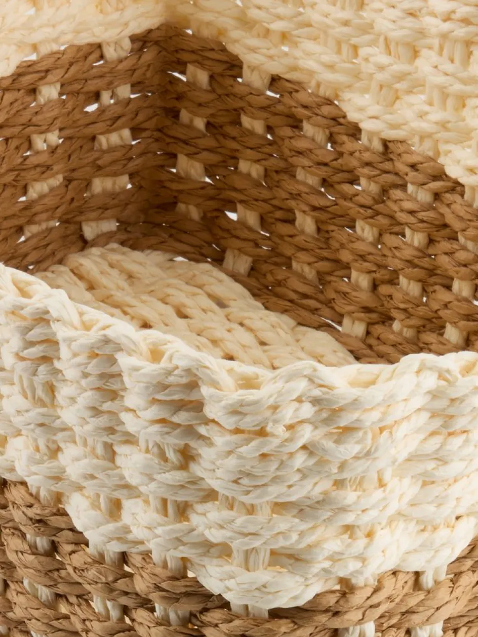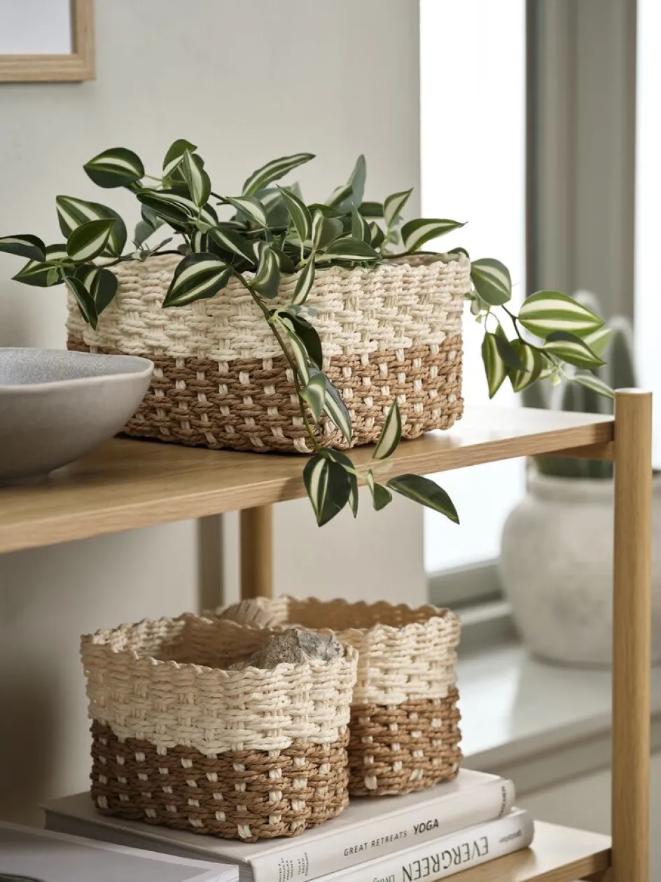 Lot de paniers coloris brun naturel et crème au design tissé, alliant style et rangement pratique. Idéal pour organiser de petits objets dans la salle de bain ou la chambre. Le lot comprend deux petits paniers et un panier de taille moyenne. l19/12 x L26/18 x H12 cm