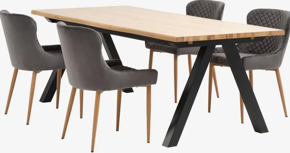 Table de salle à manger avec possibilité d’ajouter des rallonges. Le plateau est en placage décoratif chêne et MDF et les pieds en bois massif noir. Le bois est laqué pour une plus grande durabilité. En ajoutant des rallonges, vous pouvez facilement allonger la table à 255 ou 300 cm pour accueillir plus d’invités. Les rallonges peuvent être achetées séparément. l100 x L210 x H75 cm