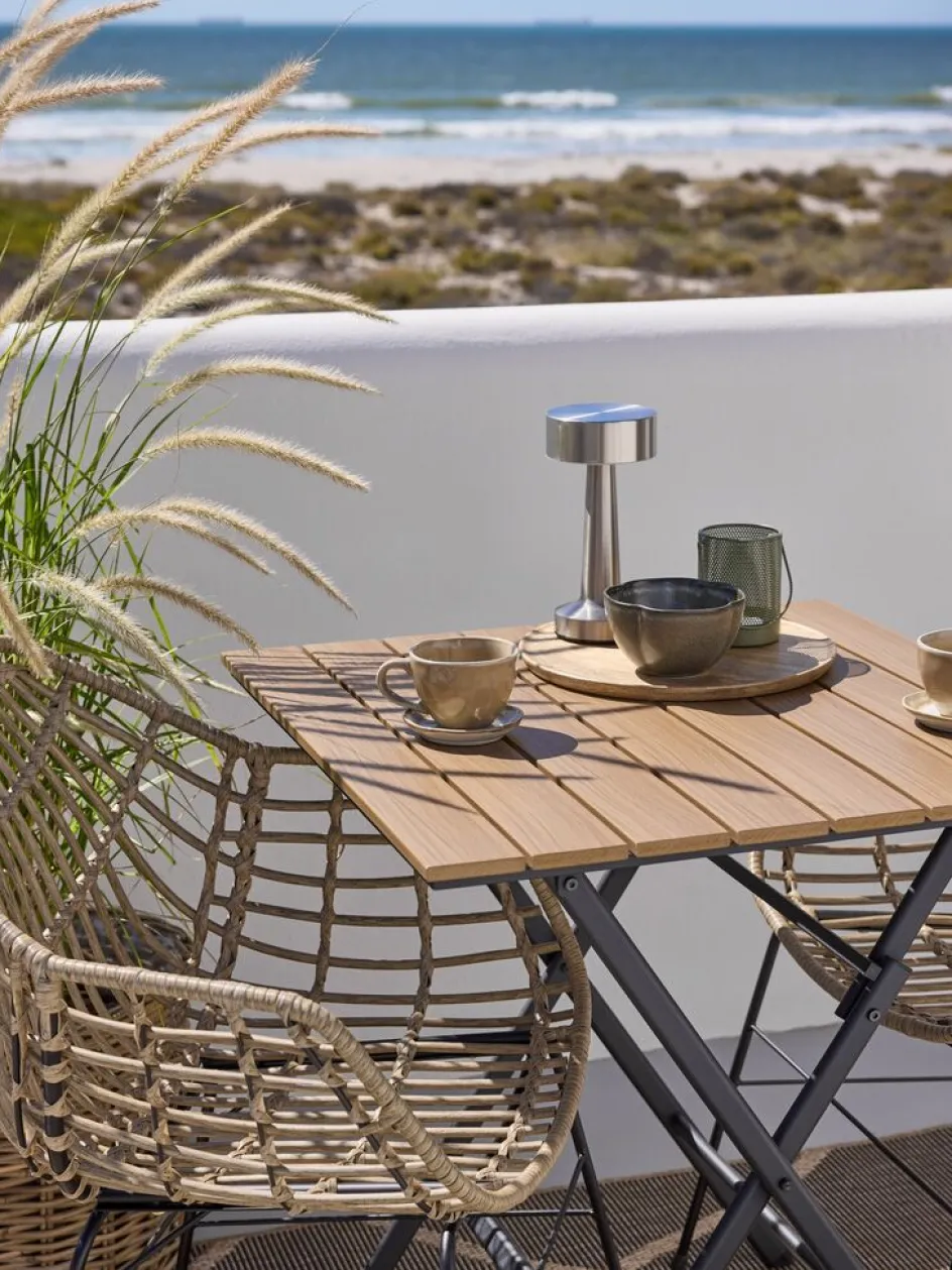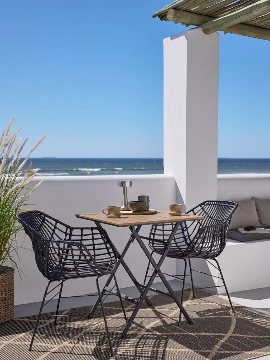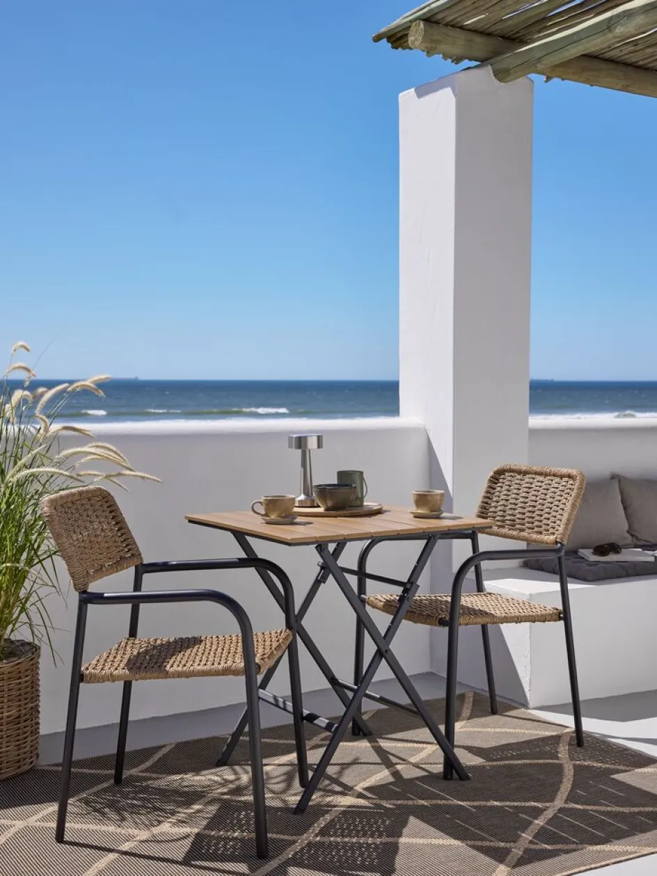 Table bistrot avec un plateau en imitation bois. Le cadre et les pieds noirs sont en acier peint par poudrage. Le bois artificiel, ou imitation bois, a l’apparence et la texture du bois naturel sans nécessiter d’entretien. La table peut être pliée à plat et rangée facilement. l65 x L65 x H73 cm