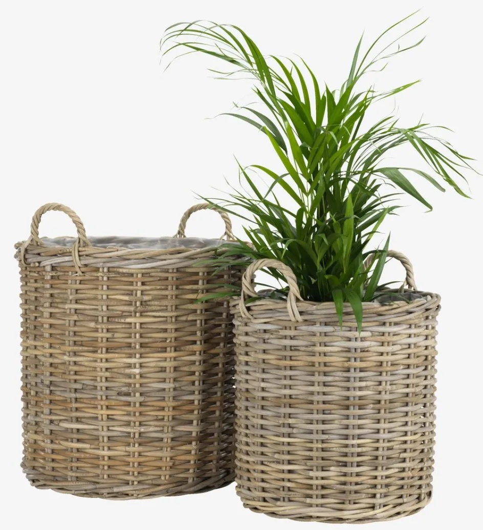 Lot de 2 paniers pour plantes en kubu tissé et rotin avec une doublure en plastique. Ces paniers polyvalents et rustiques sont idéaux pour les plantes ou le rangement décoratif. Les poignées facilitent le déplacement des paniers et leur placement selon vos envies. Ø50/40 x H58/48 cm