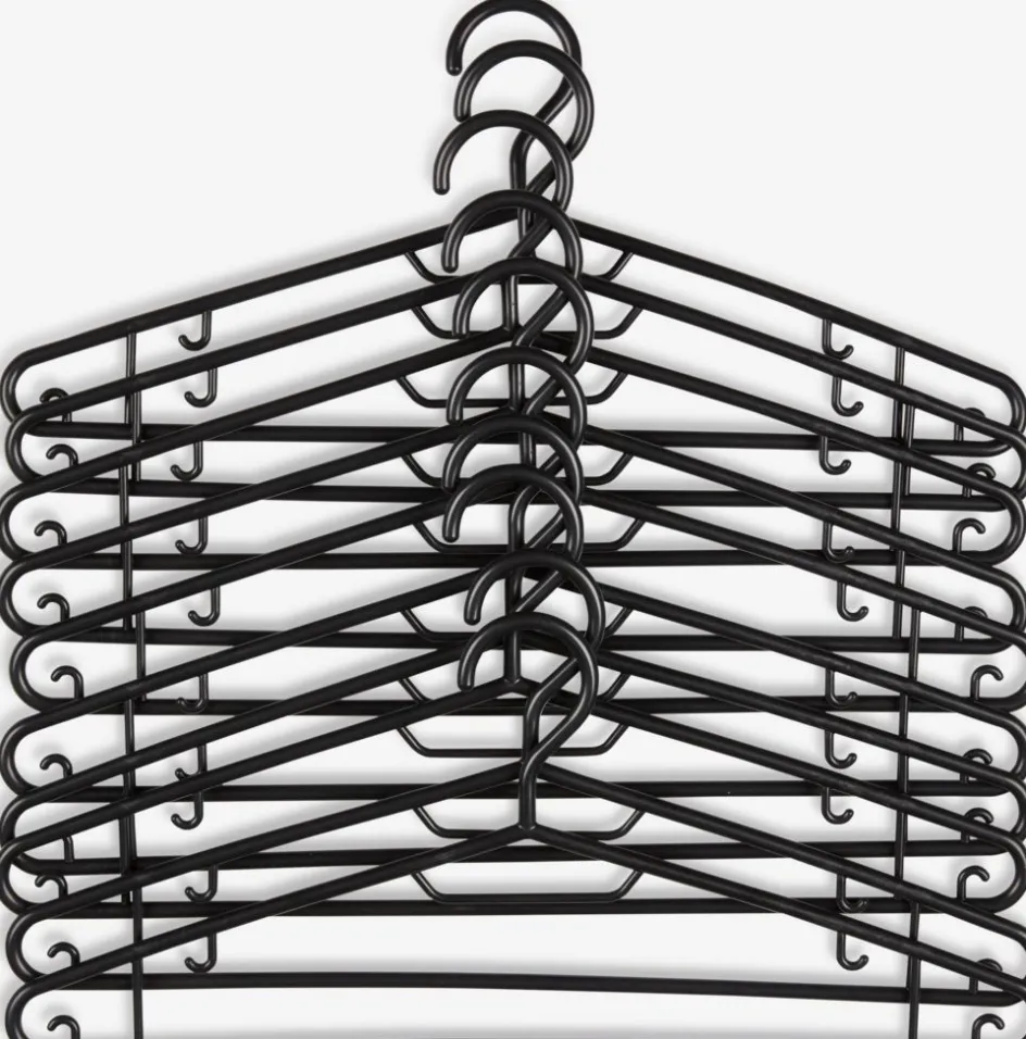 Lot de 10 cintres noirs en plastique résistant. Le design épuré permet d’économiser de l’espace et des crochets supplémentaires offrent des options de suspension polyvalentes. l7 x L41 x H18 cm