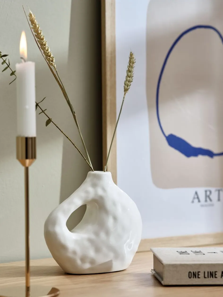 Vase en porcelaine blanche au design unique avec une ouverture originale. Ce vase se distingue par ses courbes organiques et sa finition lisse et brillante, ajoutant une touche moderne et élégante à chaque intérieur. Idéal pour des fleurs séchées ou comme pièce décorative. l16 x L7 x H14 cm
