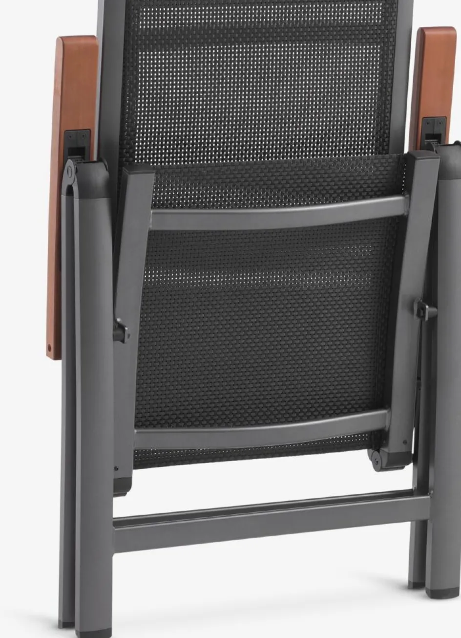 Chaise inclinable grise avec assise et dossier en textilène et structure en aluminium peint par poudrage. Les accoudoirs ont une finition en bois dur FSC® huilé pour un aspect élégant. Le dossier peut être incliné en 6 positions. Le textilène est un matériau confortable résistant à la décoloration qui sèche rapidement et est facile à nettoyer. L’aluminium est un matériau léger et robuste qui ne rouille pas. Le bois durable est traité avec de l’huile pour le protéfer et rehausser sa couleur naturelle. L’huilage régulier du bois est recommandé pour préserver sa couleur et le protéger de l’humidité. La chaise de jardin peut être pliée à plat pour la transporter et la ranger facilement.