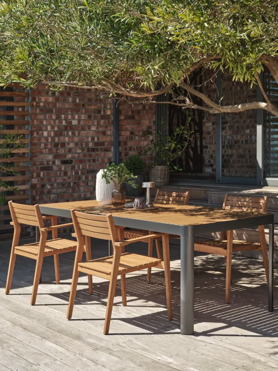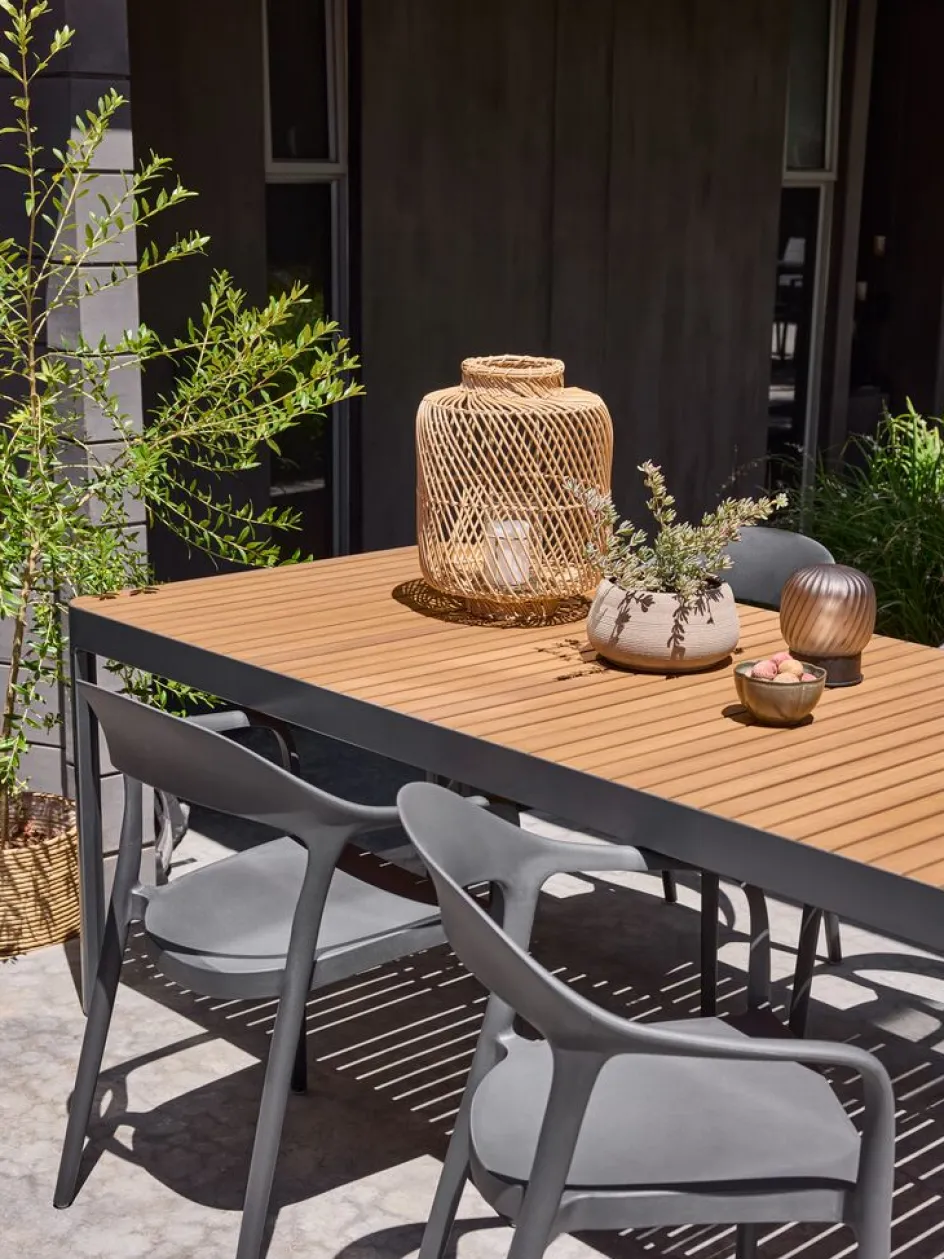 Table de jardin avec un plateau en bois dur FSC® huilé. Le cadre gris foncé et les pieds sont en aluminium peint par poudrage. Le bois durable est traité avec de l’huile afin de le protéger et de rehausser sa couleur naturelle. L’huilage régulier du bois est recommandé pour préserver sa couleur et le protéger de l’humidité. L’aluminium est un matériau léger et robuste qui ne rouille pas. l91 x L211 x H75 cm