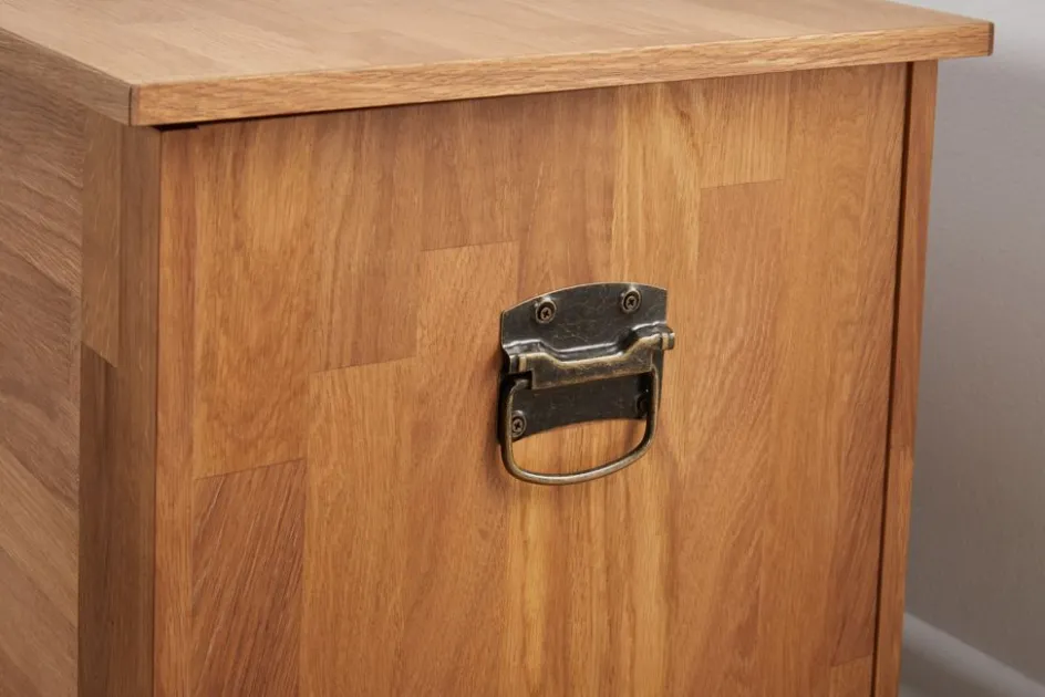 En panneau de particules plaqué chêne, finition huilée. Poignées : acier. Pieds : chêne massif. l100 x H45 x P45 cm