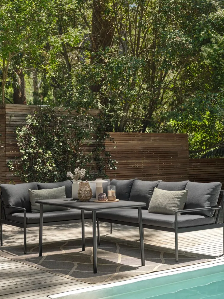 Le salon de jardin se compose d’un canapé d’angle 6 places et d’une table lounge. Ce salon d’extérieur assorti peut accueillir confortablement 6 personnes.