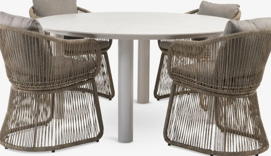 Ensemble meubles de jardin 4 places. Table: Aluminium et pierre frittée. Le plateau en pierre frittée résiste aux rayures, aux taches et à la chaleur. Ø150 x H74 cm. Chaise: Acier et cordage en polyéthylène. Incl. coussins haut de gamme avec housse résistante à structure tissée.