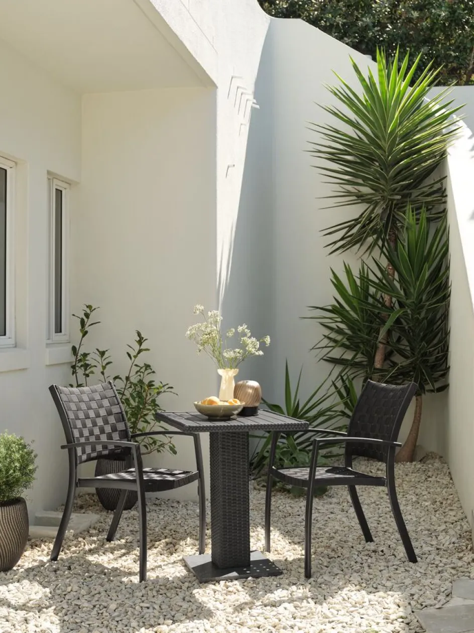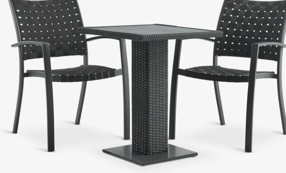 Ensemble bistrot 2 places. Table: Aluminium, granit, polyrotin et imitation bois. l60 x L60 x H74 cm. Chaise: Aluminium et polypropylène. Empilable.