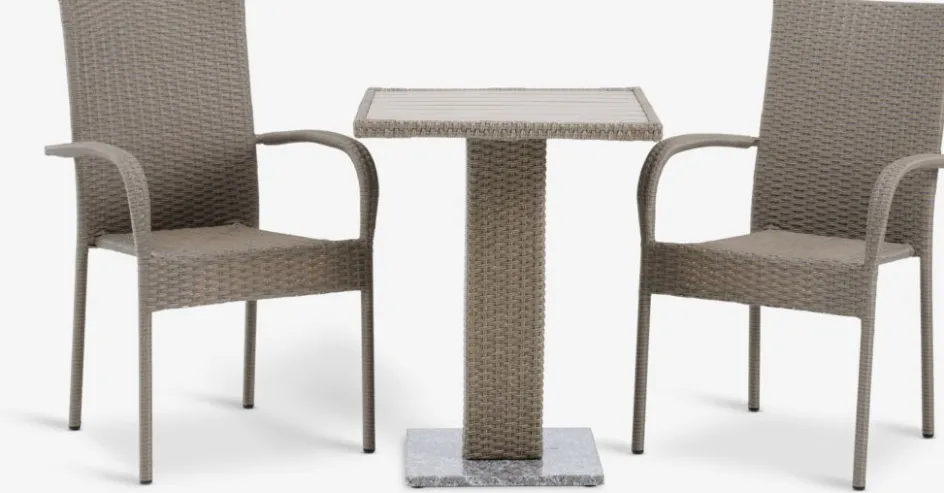 Ensemble bistrot 2 places. Table : aluminium, granit, polyrotin et imitation bois. l60 x L60 x H74 cm. Chaise : acier et polyrotin. Pliable.