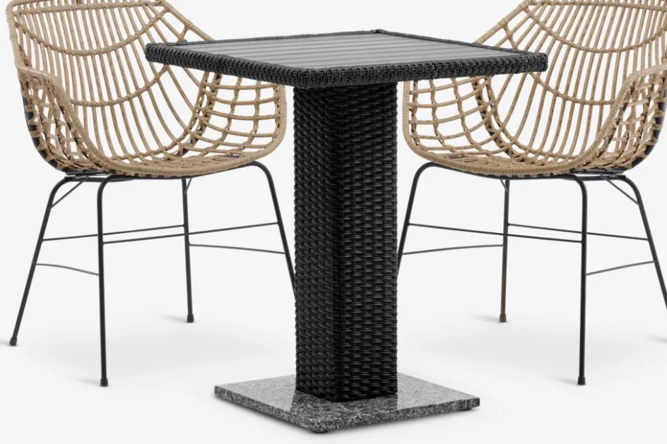 Ensemble bistrot 2 personnes. Table : aluminium, granit, polyrotin et imitation bois. l60 x L60 x H74 cm. Chaise : acier et polyrotin.