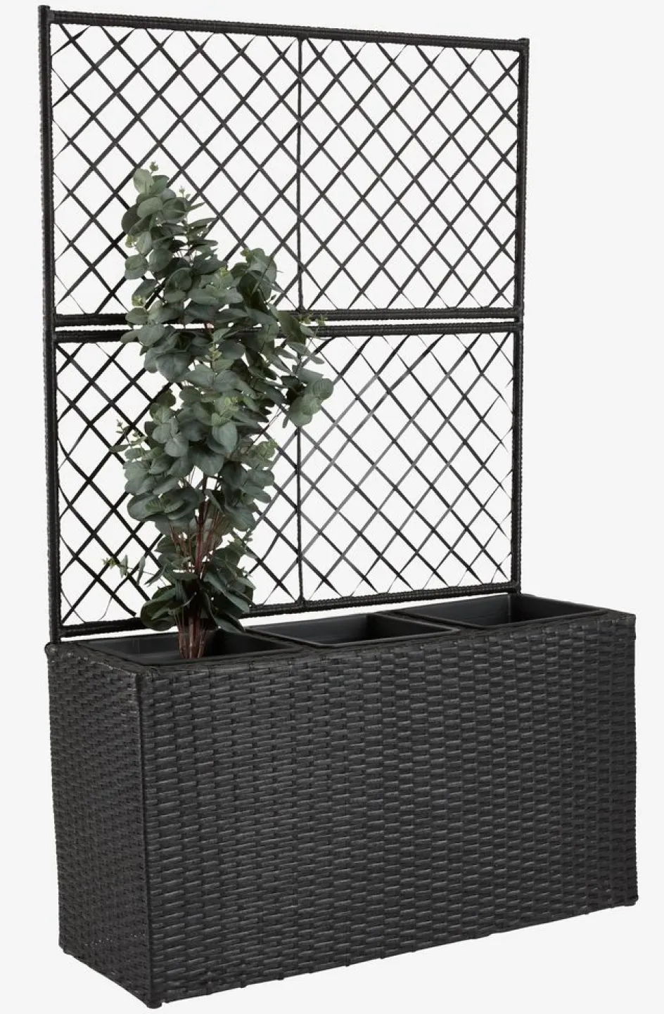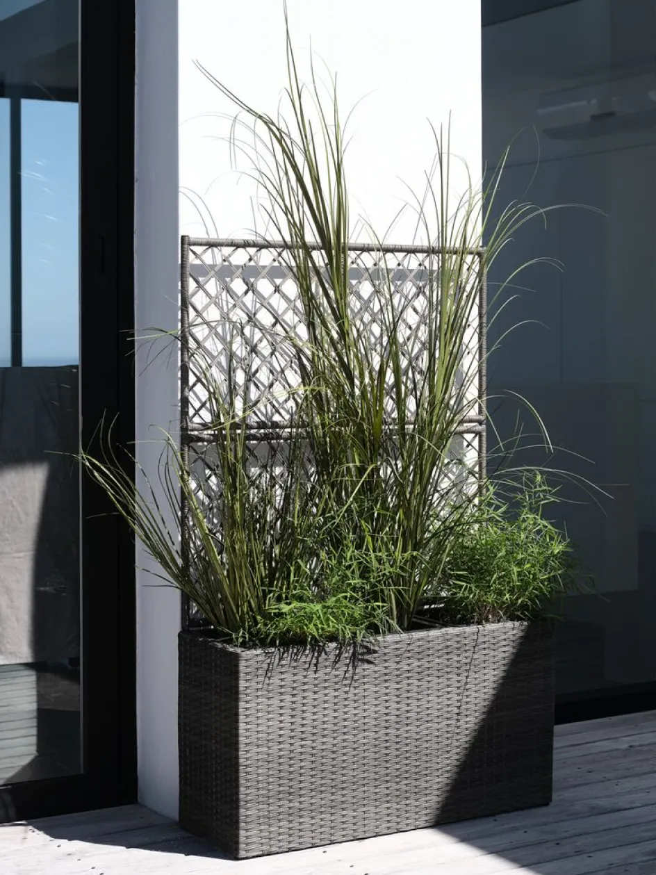 Jardinière noire avec treillis, en polyrotin et acier galvanisé. Idéale pour créer une clôture verte autour de votre terrasse ou pour diviser votre espace extérieur. Le treillis offre un support pour les plantes grimpantes et, une fois couvert, il donne un effet beau et décoratif. Un trou de drainage peut facilement être créé pour permettre l’évacuation d’excès d’eau. l30 x L83 x H130 cm
