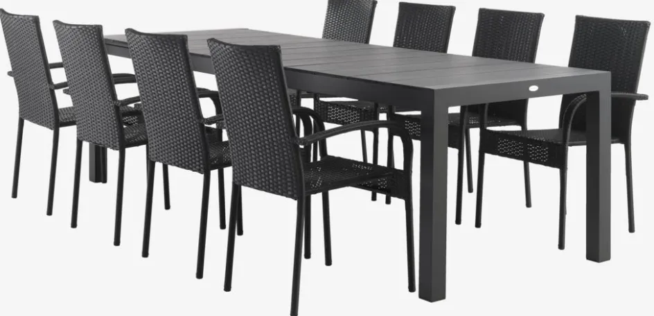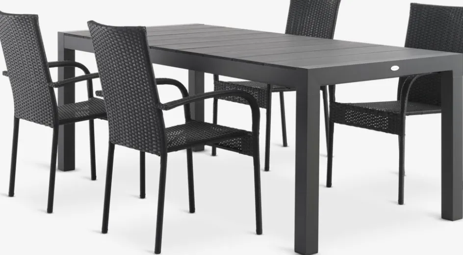 Ensemble meubles de jardin 4 places. Table: Aluminium et imitation bois. Incl. 1 rallonge pouvant être rangée sous le plateau. l95 x L208/272 x H76 cm. Chaise: Acier et polyrotin. Empilable.