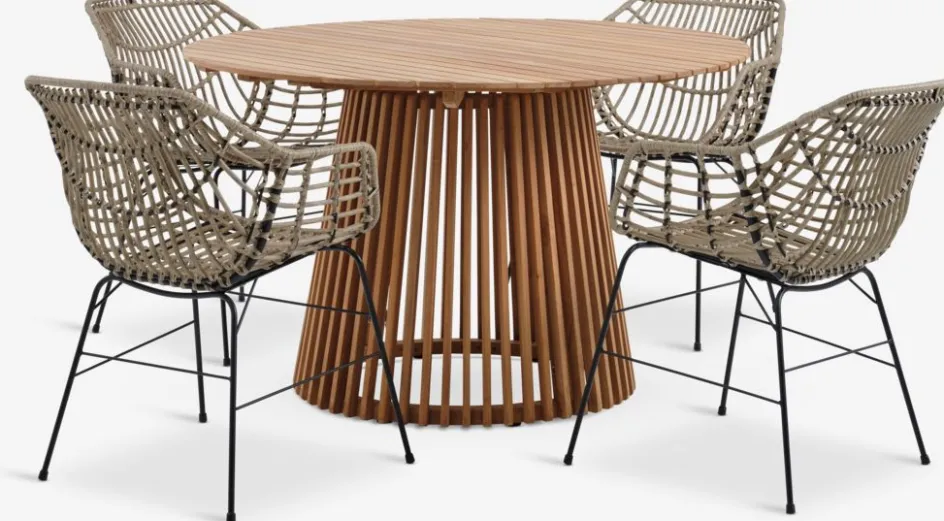 Ensemble meubles de jardin 4 places. Table: Teck FSC® massif. Ø120 x H75 cm Chaise: Acier et polyrotin.