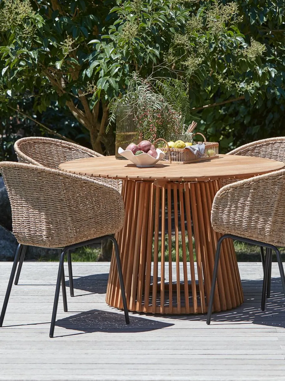 Ensemble meubles de jardin 4 personnes. Table : teck FSC® massif. Ø120 x H75 cm. Chaise : acier et polyrotin.