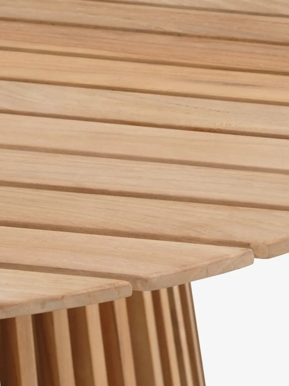 Table de jardin ronde en teck massif FSC®. Piétement avec lamelles verticales en bois. Le teck est un bois élégant et résistant qui contient beaucoup d’huile naturelle, ce qui l’empêche d’absorber l’humidité. Avec le temps, le teck prend une patine gris argenté. Ø120 x H75 cm
