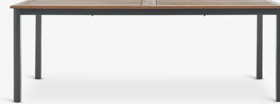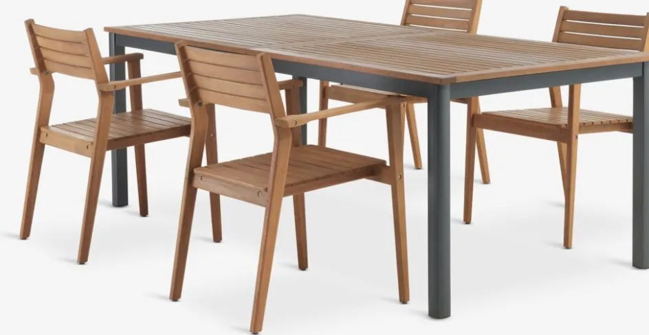 Ensemble meubles de jardin 4 personnes. Table: Aluminium et bois dur FSC® huilé. Incl. 1 rallonge pouvant être rangée sous le plateau. l99 x L214/297 x H75 cm. Chaise: Bois dur FSC® huilé. Empilable.