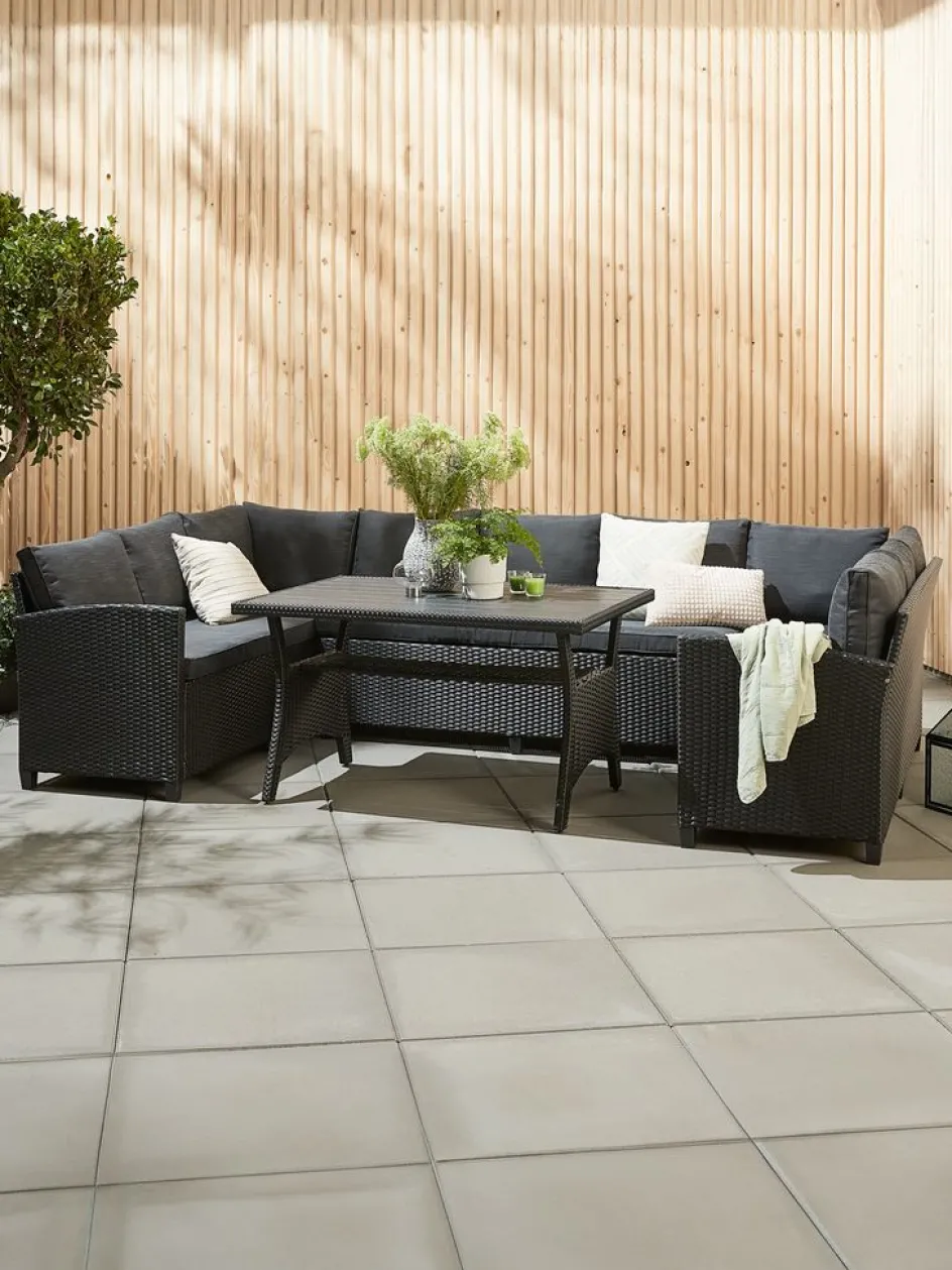 Créez un espace extérieur agréable et confortable avec le spacieux ensemble lounge ULLEHUSE. Ce salon de jardin 9 places noir se compose d’un canapé en U avec des coussins confortables et d’une table lounge assortie avec un plateau en bois artificiel. Le canapé lounge dispose d’un rangement pratique sous l’assise.