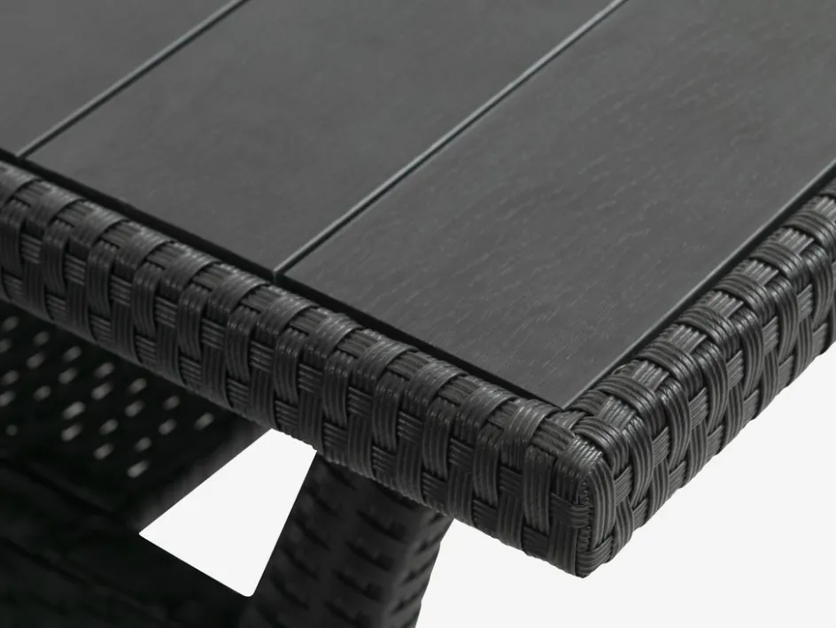 La table lounge est dotée d’un plateau en bois artificiel. Elle présente l’aspect et la texture du bois naturel sans nécessiter d’entretien. Elle est fabriquée à partir de plastique, tel que le polystyrène, qui constitue un matériau durable. Le bois artificiel, ou imitation bois, résiste aux intempéries, ce qui signifie qu’il peut supporter l’exposition au soleil, à l’humidité et aux changements de température. Évitez de placer des objets en verre directement exposés au soleil sur le bois artificiel, car cela pourrait causer des traces de brûlure et une décoloration.