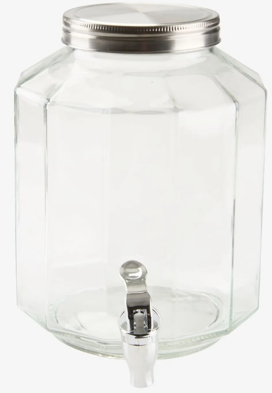 Bonbonne avec robinet en verre transparent avec un couvercle en acier inoxydable. La capacité de 4,25 litres est idéale pour servir des boissons fraîches lors de fêtes dans le jardin ou en camping. Un robinet intégré permet un libre-service simple. Ø18 x H24 cm
