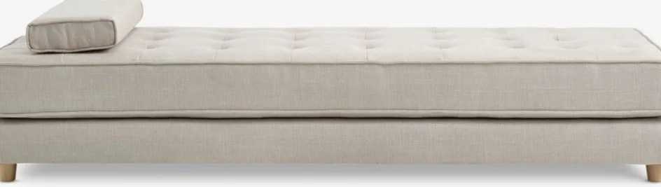En contreplaqué, lamibois, acier. Revêtement : polyester. Garnissage : mousse polyuréthane (25/45 kg/m³). Pieds : bois de caoutchouc massif. La banquette se convertit facilement en lit. Couchage 152×190 cm. l190 x H35 x P76 cm