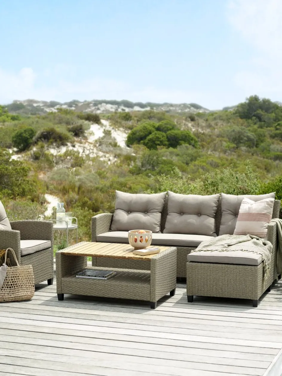 Détendez-vous dans le confort de l’ensemble lounge VEN. Cet ensemble de jardin 4 places se compose d’un canapé et de 2 fauteuils avec des coussins confortables, ainsi que d’une table lounge assortie avec un plateau en bois dur FSC®.