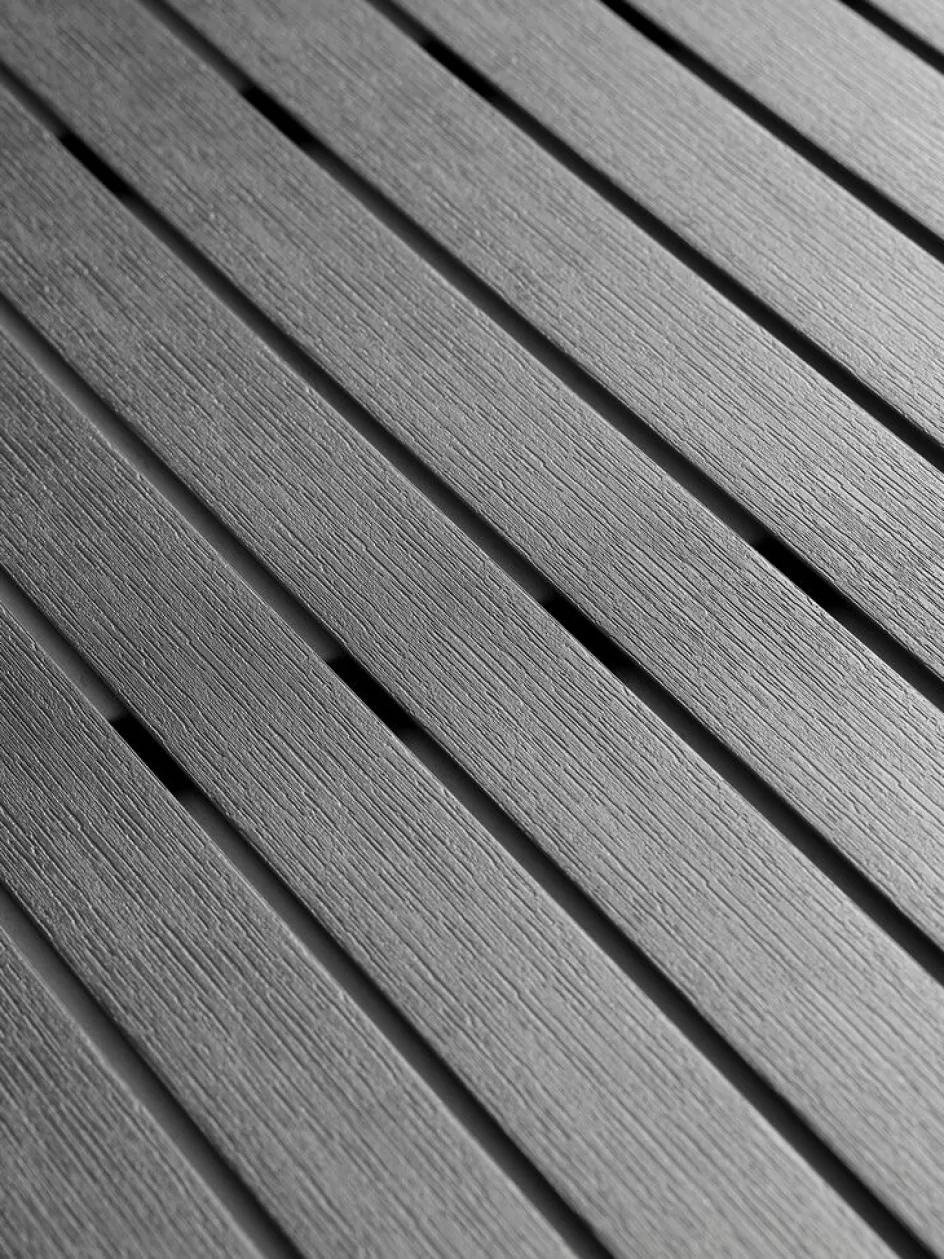 Ensemble meubles de jardin 4 places. Table: Acier et imitation bois. l90 x L149 x H74 cm. Chaise: Plastique résistant aux UV (20% recyclé). Empilable.