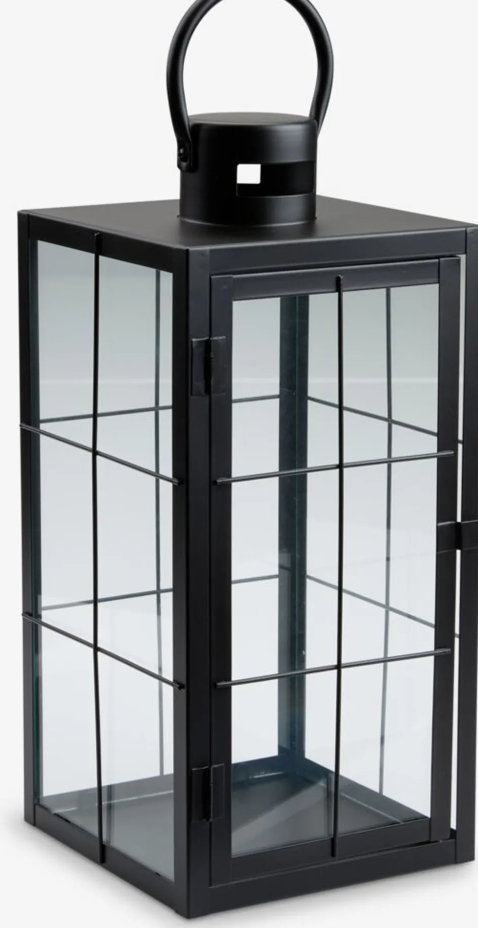 Lanterne au design rectangulaire moderne en acier noir et verre transparent. Elle est idéale pour exposer une bougie afin de créer une atmosphère chaleureuse au sol ou sur une table. l16 x L16 x H36 cm