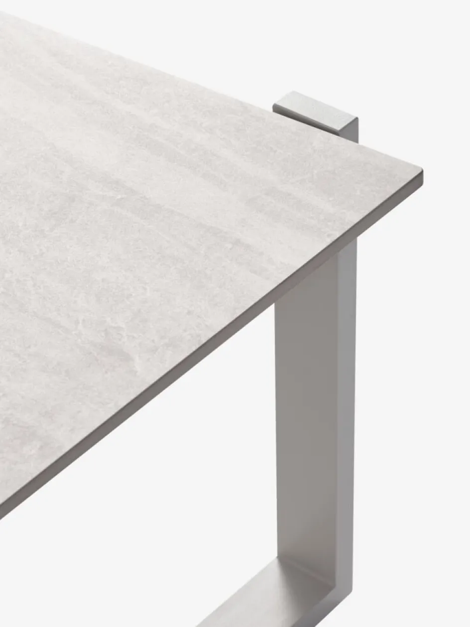La table lounge est dotée d’un plateau en pierre frittée. La surface en pierre est très résistante aux rayures, aux taches et à la chaleur. Vous pouvez par exemple poser des casseroles et des poêles chaudes directement sur la surface. La pierre frittée est résistante aux intempéries, ce qui signifie qu’elle peut supporter l’exposition au soleil, à l’humidité et aux changements de température.