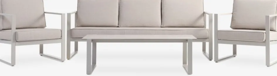 Cet ensemble lounge d’extérieur est doté d’un cadre en aluminium élégant et léger. Il résiste à la rouille et ne nécessite aucun entretien. L’aluminium résiste aux intempéries, ce qui signifie qu’il peut supporter l’exposition au soleil, à l’humidité et aux changements de température.