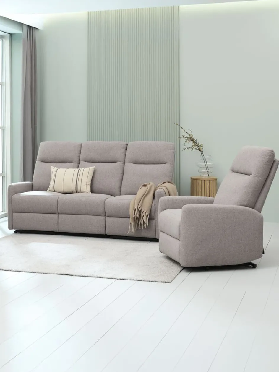 Structure : contreplaqué. Garnissage : mousse polyuréthane (28 kg/m³), ressorts ensachés. Revêtement : polyester. Pieds : polyamide. Repose-pied intégré, mécanisme de basculement à commande électrique. l78 x H87/111 x P97/164 cm